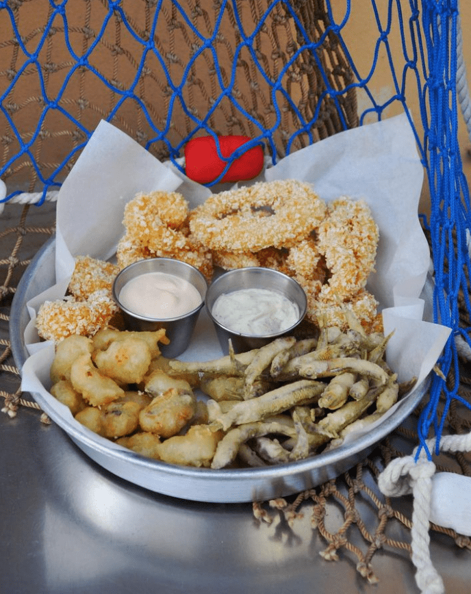 2. Смачний бургер з червоним окунем та щупальцями кальмарів. Такий незвичний мікс доповнює соус Цезар. Подається бургер разом з картоплею фрі. Смак просто фантастичний, тому обов’язково варто спробувати.